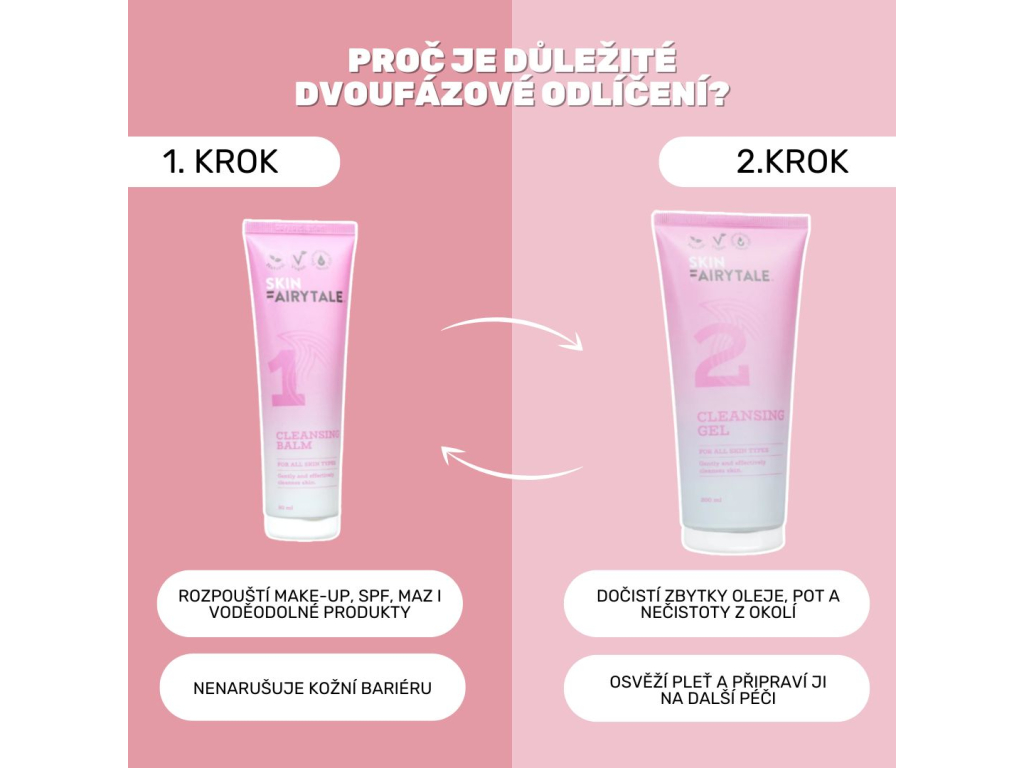 Výhodný balíček dvou šetrných čisticích produktů nyní se slevou 10 % – Hutný, ale jemný čisticí balzám pro první krok čistící rutiny. Spolehlivě rozpouští SPF, voděodolný make-up i každodenní nečistoty - bez podráždění, bez mastného filmu a bez vysušení. Šetrné složení bez parfemace, vhodný i pro citlivou pleť. Šetrný gel pro každodenní čištění pleti bez vysušení. Nechte svou pleť dýchat s jemným čisticím gelem, který důkladně odstraňuje nečistoty, aniž by narušil její přirozenou rovnováhu. Obsahuje zklidňující niacinamid, výtažek z okurky a bisabolol z heřmánku - ideální jako druhý krok v dvojfázovém čištění nebo samostatně pro svěží, hydratovanou a klidnou pokožku.