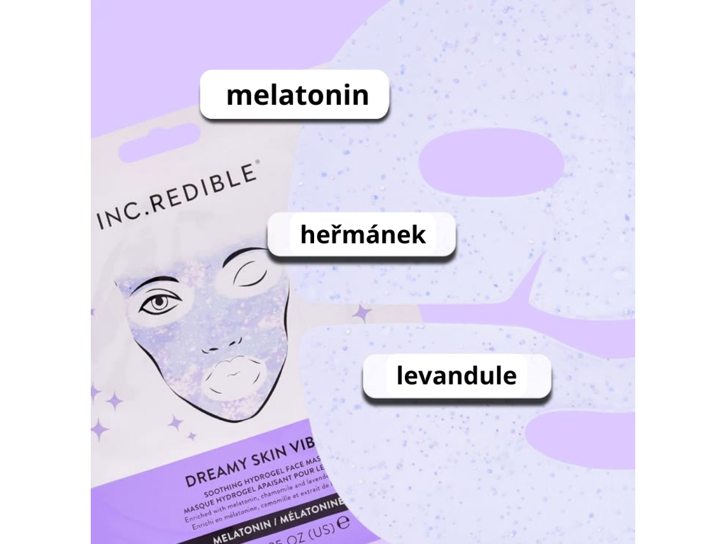 Hydrogelová maska je obohacena o uklidňující levanduli, heřmánkový extrakt a ochranný melatonin, který pomáhá redukovat záněty. Kyselina hyaluronová je jedničkou v hydrataci pleti – váže na sebe velké množství vody a udržuje pokožku krásně vyživenou a vláčnou. Důkladná hydratace je navíc účinnou prevencí proti stárnutí pleti a tvorbě vrásek.