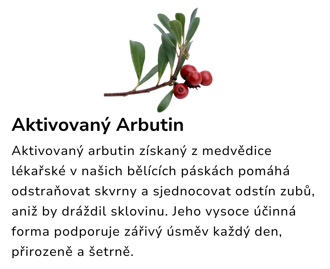Aktivovaný arbutin získaný z medvědice lékařské v našich bělících páskách pomáhá odstraňovat skvrny a sjednocovat odstín zubů, aniž by dráždil sklovinu. Jeho vysoce účinná forma podporuje zářivý úsměv každý den, přirozeně a šetrně.