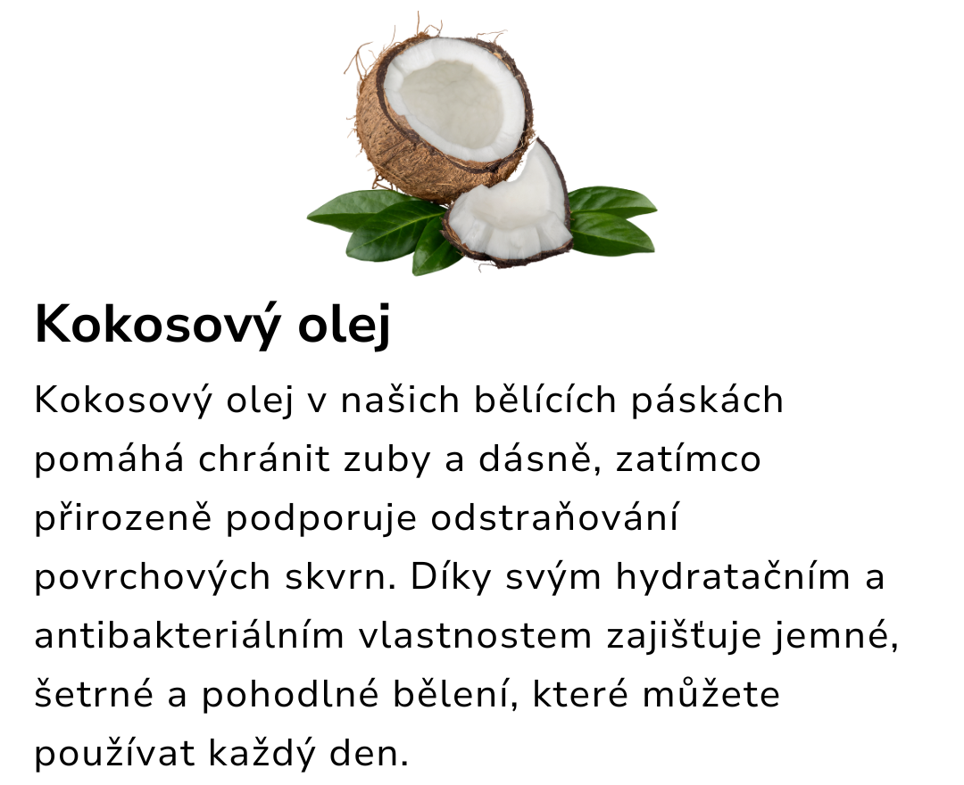 Kokosový olej v našich bělících páskách pomáhá chránit zuby a dásně, zatímco přirozeně podporuje odstraňování povrchových skvrn. Díky svým hydratačním a antibakteriálním vlastnostem zajišťuje jemné, šetrné a pohodlné bělení, které můžete používat každý den.