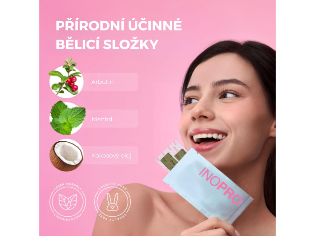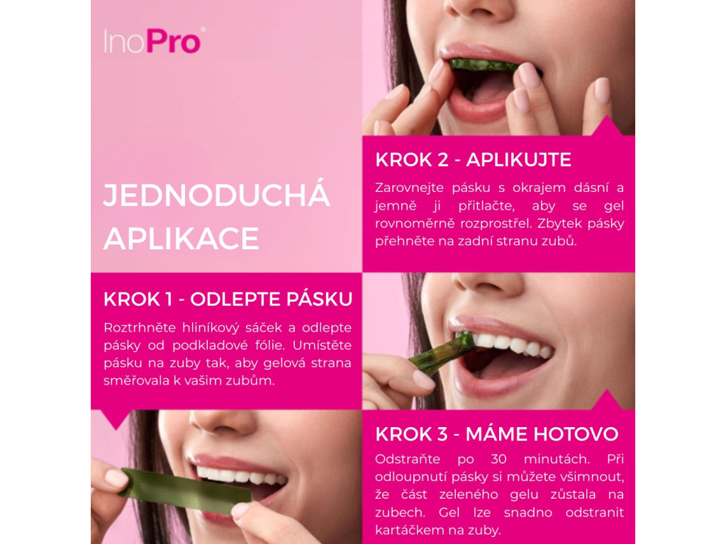 Roztrhněte hliníkový sáček a odlepte pásky od podkladové fólie. Umístěte pásku na zuby tak, aby gelová strana směřovala k vašim zubům.