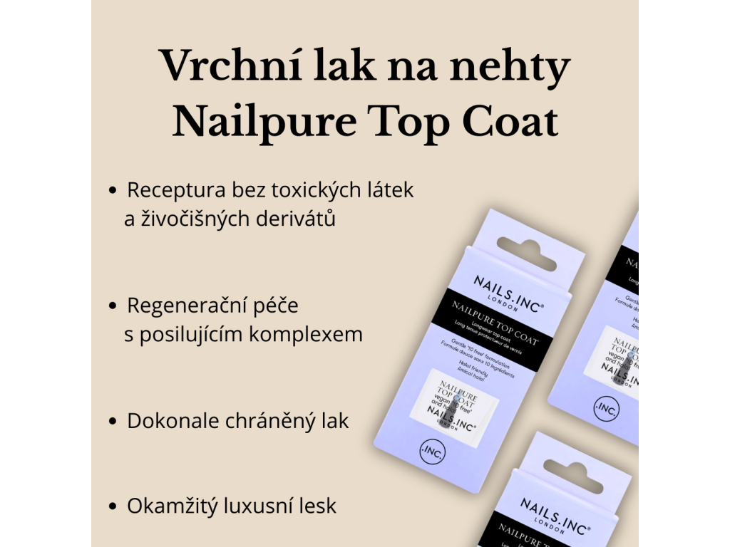 Tento lak se používá jako vrchní vrstva po dokončení veškerého zdobení s barevnými laky či jinými produkty. NailPure Top Coat chrání lak na nehtech proti poškození a blednutí a dodává manikúře úžasný, dlouhotrvající lesk. Top lak prodlouží životnost vaší manikúry až na 7 dní, takže budete mít krásné a hladké nehty bez vady po celý týden. Lak neobsahuje alkohol a je obohacen o patentovaný regenerační komplex Nails.INC – dvojnásobnou směs aldehydu, zinku a vápníku, která podporuje produkci keratinu pro pevnější, silnější a zdravější nehty. Složení NailPure je „10 free“, což znamená, že neobsahuje ftaláty (včetně DBP), toluen, formaldehyd, formaldehydovou pryskyřici, živočišné deriváty ani kafr.