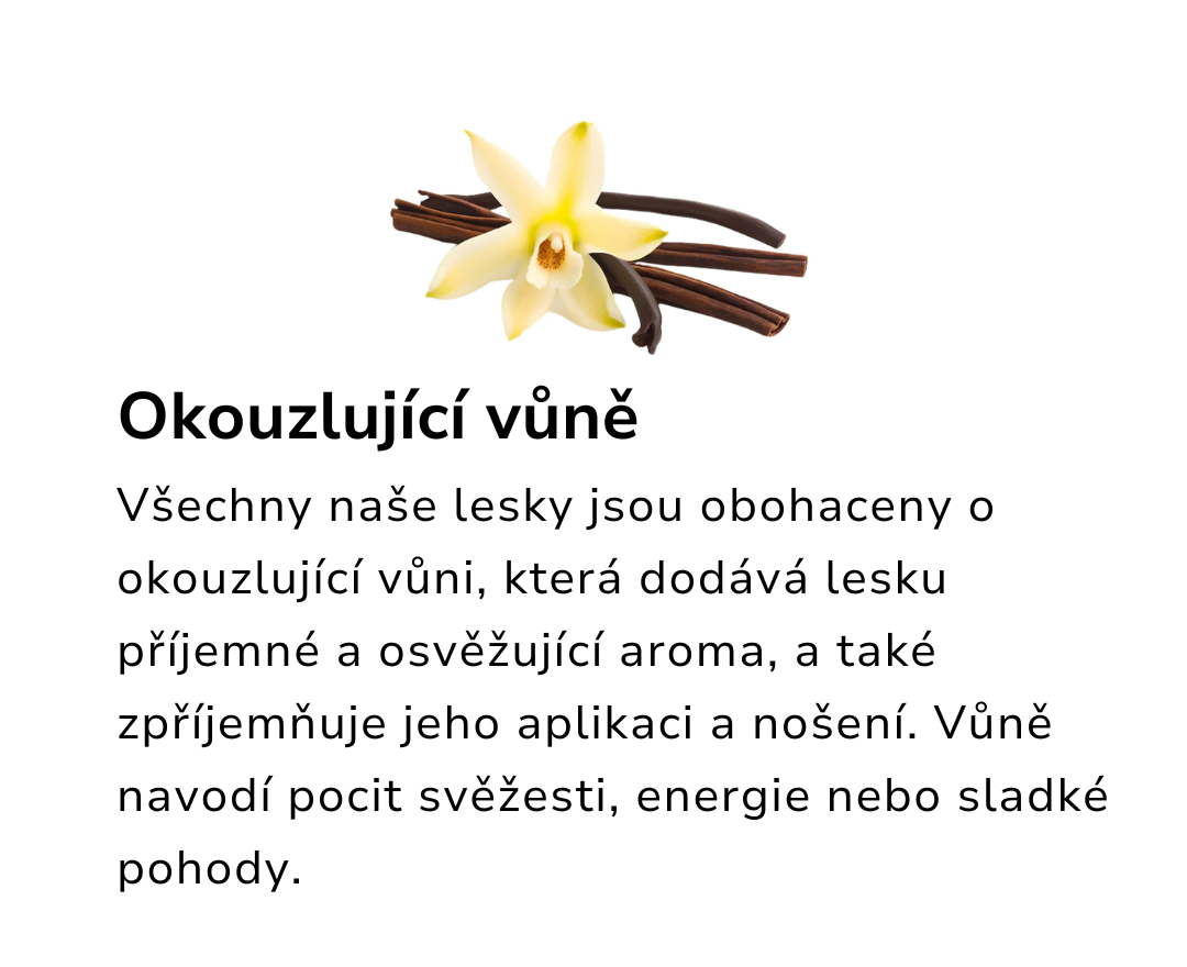 Všechny naše lesky jsou obohaceny o okouzlující vůni, která dodává lesku příjemné a osvěžující aroma, a také zpříjemňuje jeho aplikaci a nošení. Vůně navodí pocit svěžesti, energie nebo sladké pohody.