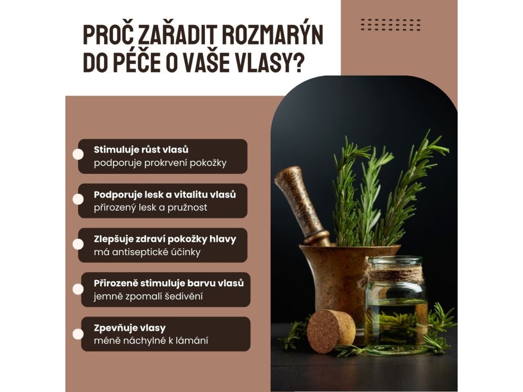 Rozmarýnový olej od SkinFairytale je intenzivní vyživující péče o pokožku hlavy, ideální pro každého, kdo se potýká s řídnutím, vypadáváním vlasů nebo zpomaleným růstem. Jeho složení je založeno na kombinaci rozmarýnového oleje, pečlivě vybraných rostlinných olejů, přírodních extraktů a esenciálních olejů, které ochranu před volnými radikály