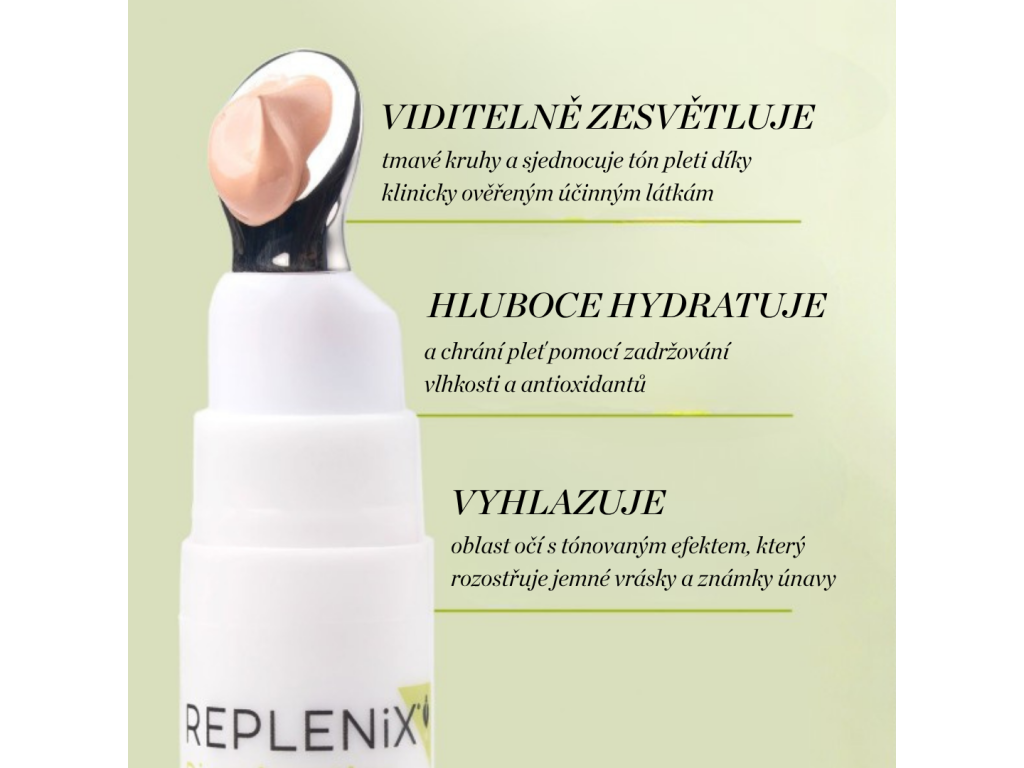 REPLENIX Tinted Brightening Eye Cream je vědecky vyvinutý oční krém s nejčistšími a nejúčinnějšími medicínskými aktivními látkami. Formule je jemná a pH vyvážená, ideální pro extrémně citlivou oblast očí. Krém obsahuje univerzální pigment, který se přirozeně přizpůsobí většině tónů pleti a okamžitě rozjasní tmavé kruhy, jemné linky a hyperpigmentaci, čímž oční okolí získá jasnější, mladistvější a zářivý vzhled.