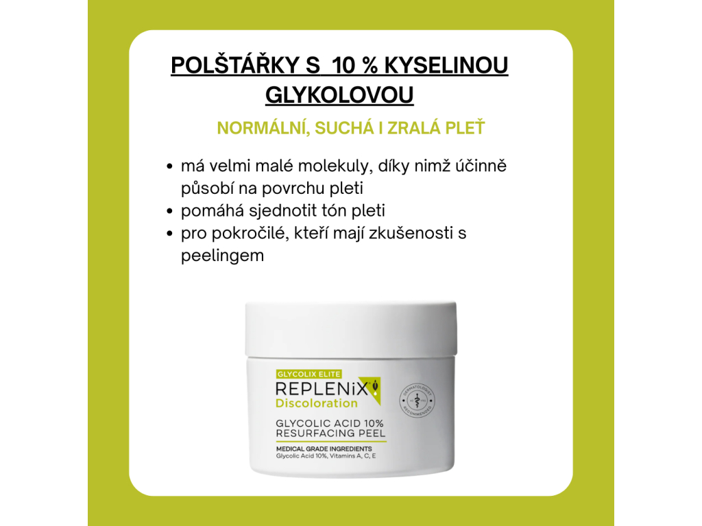 Replenix 10% Glycolic Acid Pads sú čistiace a exfoliačné tampóny s 10 % kryštalickou glykolovou kyselinou. Táto vysoko účinná, no šetrná formula jemne odstraňuje odumreté kožné bunky, podporuje obnovu buniek a zjemňuje textúru pokožky. Pravidelné používanie pomáha redukovať drobné nedokonalosti, zjednocuje tón pleti a odhaľuje hladší a jasnejší vzhľad pokožky. Praktické tampóny umožňujú rýchlu, hygienickú a jednoduchú aplikáciu – ideálne pre každodennú rutinu starostlivosti o pleť.