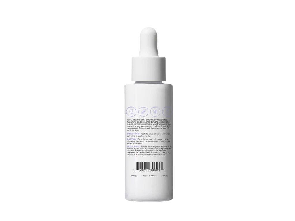 Purified Water, Glycerin, Sodium PCA, Sodium Hyaluronate, Hydrolyzed Sodium Hyaluronate, Camellia Sinensis (White Tea) Extract, Palmitoyl Tripeptide-28, Erothioneine, Glutathione, Zinc PCA, Copper PCA, Phenoxyethanol, Disodium EDTA