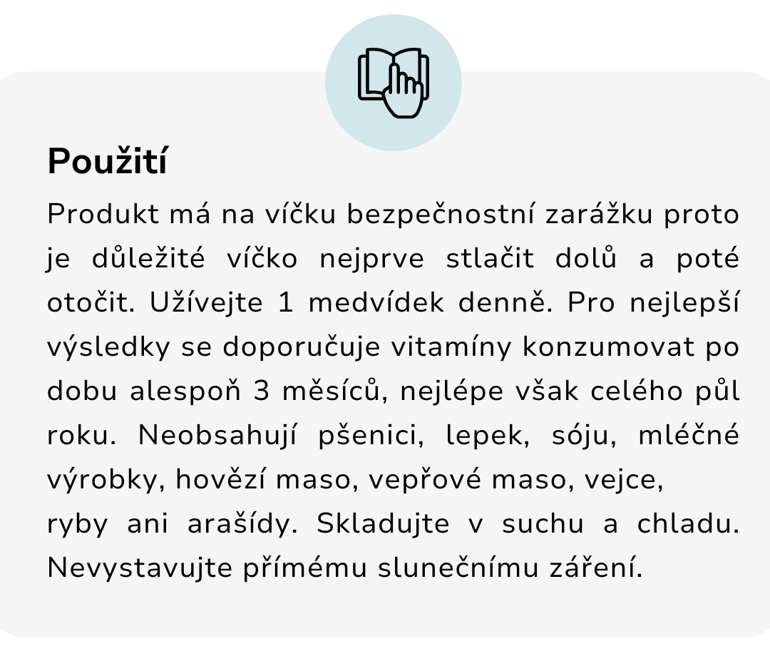 Tapiokový sirup 30 %, surový třtinový cukr, voda, vápník (trikalciumfosfát) 60 mg (7,56 %*), želírující látka (kyselina citronová, pektiny 1 %), regulátor kyselosti (citrát sodný), SmartRoot™ Hair Complex [prášek z černého bezu, inositol (inositol), MSM (methylsulfonylmethan), omega-3 mastné kyseliny (olej z řasy Schizochytrium sp.)] 40 mg**, biotin (D-biotin) 6000 μg (12000 %*), vitamín E (DL- alfa-tokoferylacetát) 4 mg (33 %*), zinek (citrát zinečnatý) 2,2 mg (22 %*), vitamín B1 (thiamin hydrochlorid) 1,2 mg (109 %*), kokosový olej 1 %, jód (jodid draselný) 42 μg (28 %*), vitamín D (ergokalciferol) 20 μg (400 %*), želírující látka (karnaubský vosk), vitamín B12 (methylkobalamin) 2,4 μg (96 %*), barvivo (brilantní modř FCF), aromata (hroznová šťáva). *RHP - referenční hodnota příjmu, **RHP není stanovena.