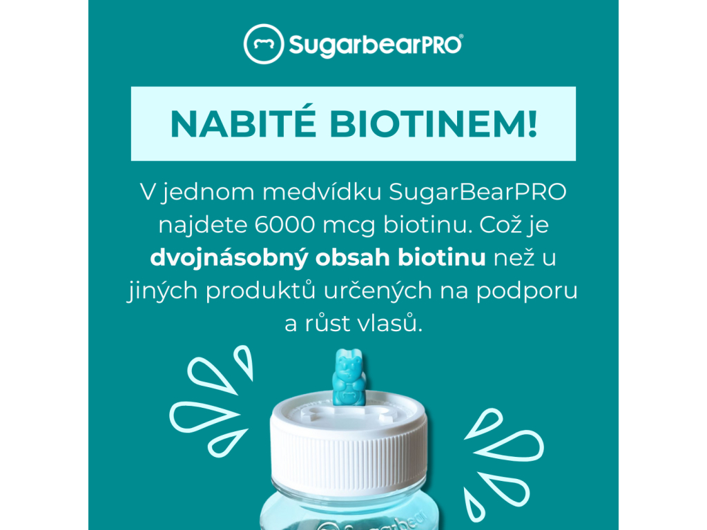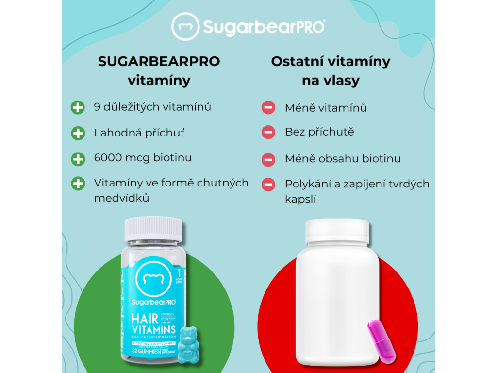 Tapiokový sirup 30 %, surový třtinový cukr, voda, vápník (trikalciumfosfát) 60 mg (7,56 %*), želírující látka (kyselina citronová, pektiny 1 %), regulátor kyselosti (citrát sodný), SmartRoot™ Hair Complex [prášek z černého bezu, inositol (inositol), MSM (methylsulfonylmethan), omega-3 mastné kyseliny (olej z řasy Schizochytrium sp.)] 40 mg**, biotin (D-biotin) 6000 μg (12000 %*), vitamín E (DL- alfa-tokoferylacetát) 4 mg (33 %*), zinek (citrát zinečnatý) 2,2 mg (22 %*), vitamín B1 (thiamin hydrochlorid) 1,2 mg (109 %*), kokosový olej 1 %, jód (jodid draselný) 42 μg (28 %*), vitamín D (ergokalciferol) 20 μg (400 %*), želírující látka (karnaubský vosk), vitamín B12 (methylkobalamin) 2,4 μg (96 %*), barvivo (brilantní modř FCF), aromata (hroznová šťáva). *RHP - referenční hodnota příjmu, **RHP není stanovena.