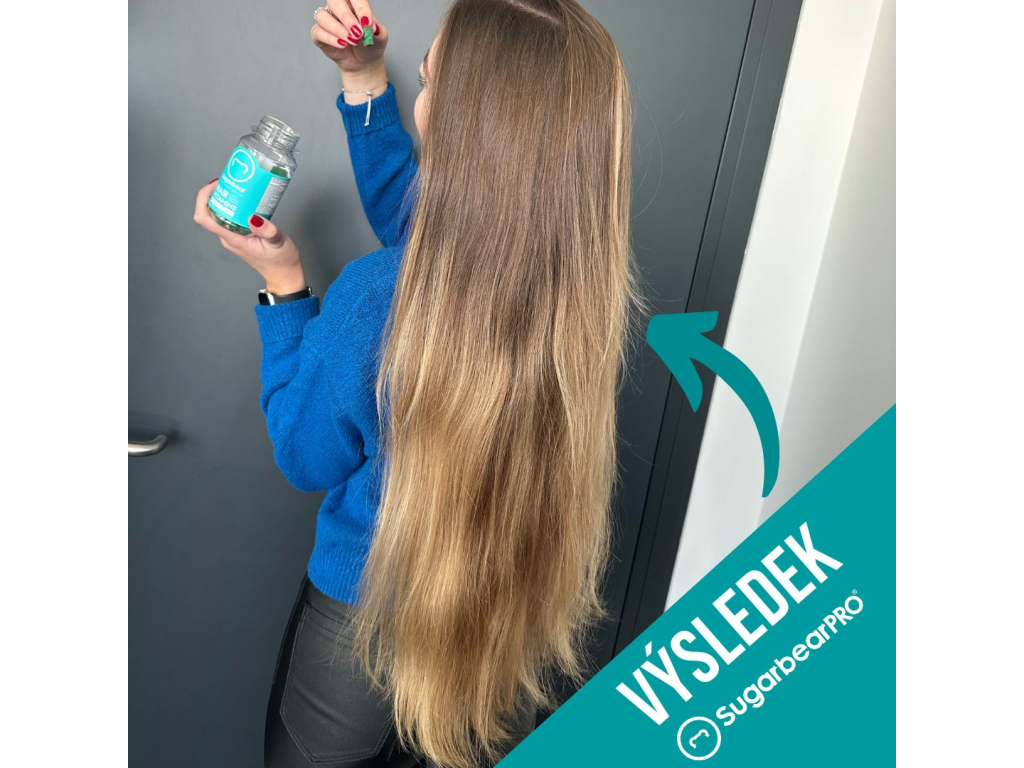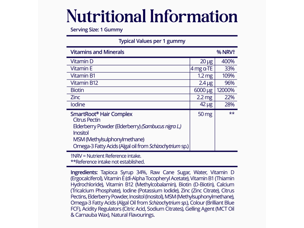 Tapiokový sirup 30 %, surový třtinový cukr, voda, vápník (trikalciumfosfát) 60 mg (7,56 %*), želírující látka (kyselina citronová, pektiny 1 %), regulátor kyselosti (citrát sodný), SmartRoot™ Hair Complex [prášek z černého bezu, inositol (inositol), MSM (methylsulfonylmethan), omega-3 mastné kyseliny (olej z řasy Schizochytrium sp.)] 40 mg**, biotin (D-biotin) 6000 μg (12000 %*), vitamín E (DL- alfa-tokoferylacetát) 4 mg (33 %*), zinek (citrát zinečnatý) 2,2 mg (22 %*), vitamín B1 (thiamin hydrochlorid) 1,2 mg (109 %*), kokosový olej 1 %, jód (jodid draselný) 42 μg (28 %*), vitamín D (ergokalciferol) 20 μg (400 %*), želírující látka (karnaubský vosk), vitamín B12 (methylkobalamin) 2,4 μg (96 %*), barvivo (brilantní modř FCF), aromata (hroznová šťáva). *RHP - referenční hodnota příjmu, **RHP není stanovena.
