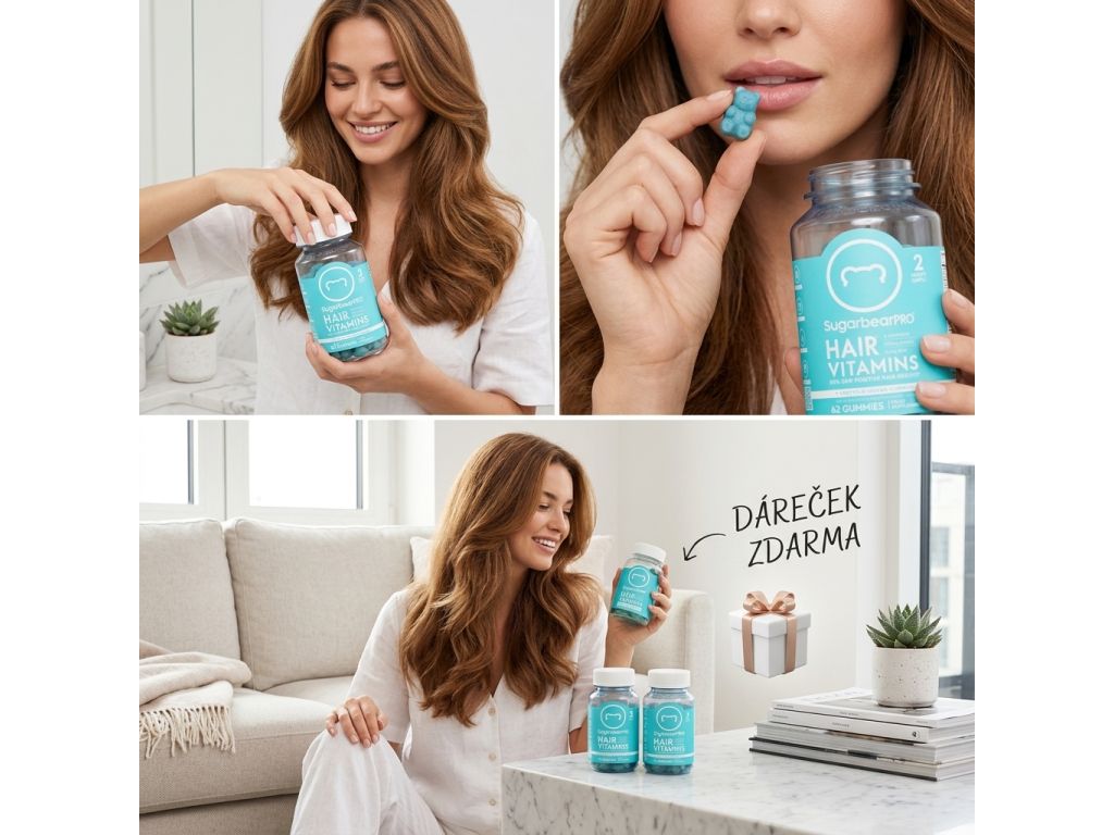 Tapiokový sirup 30 %, surový třtinový cukr, voda, vápník (trikalciumfosfát) 60 mg (7,56 %*), želírující látka (kyselina citronová, pektiny 1 %), regulátor kyselosti (citrát sodný), SmartRoot™ Hair Complex [prášek z černého bezu, inositol (inositol), MSM (methylsulfonylmethan), omega-3 mastné kyseliny (olej z řasy Schizochytrium sp.)] 40 mg**, biotin (D-biotin) 6000 μg (12000 %*), vitamín E (DL- alfa-tokoferylacetát) 4 mg (33 %*), zinek (citrát zinečnatý) 2,2 mg (22 %*), vitamín B1 (thiamin hydrochlorid) 1,2 mg (109 %*), kokosový olej 1 %, jód (jodid draselný) 42 μg (28 %*), vitamín D (ergokalciferol) 20 μg (400 %*), želírující látka (karnaubský vosk), vitamín B12 (methylkobalamin) 2,4 μg (96 %*), barvivo (brilantní modř FCF), aromata (hroznová šťáva). *RHP - referenční hodnota příjmu, **RHP není stanovena.